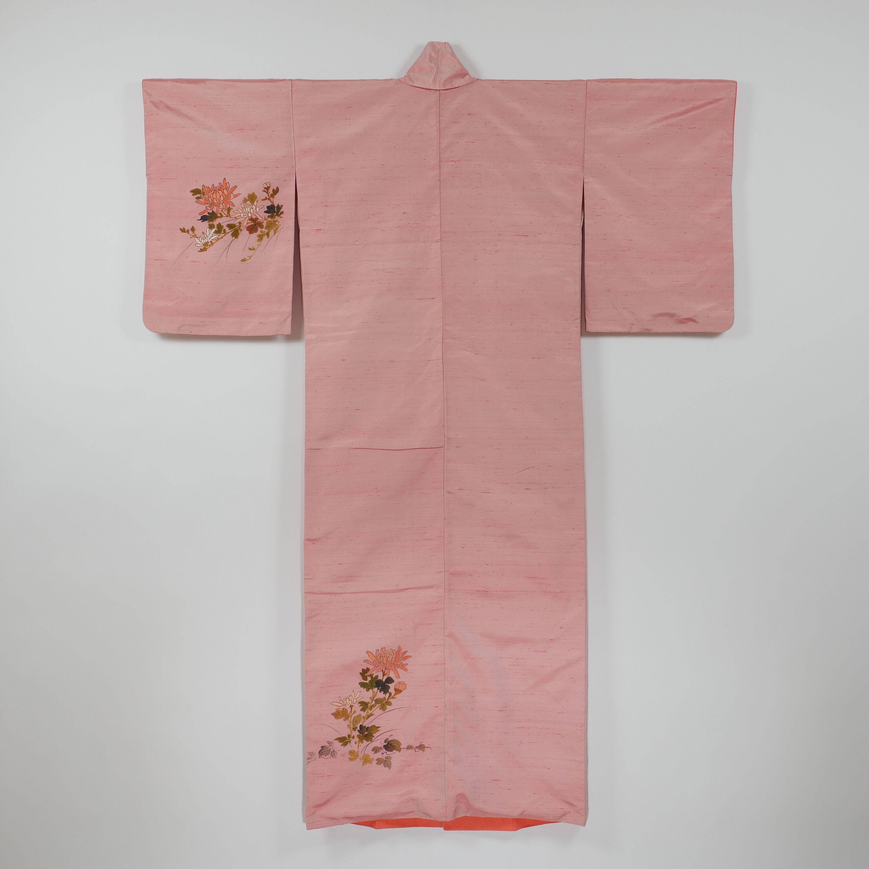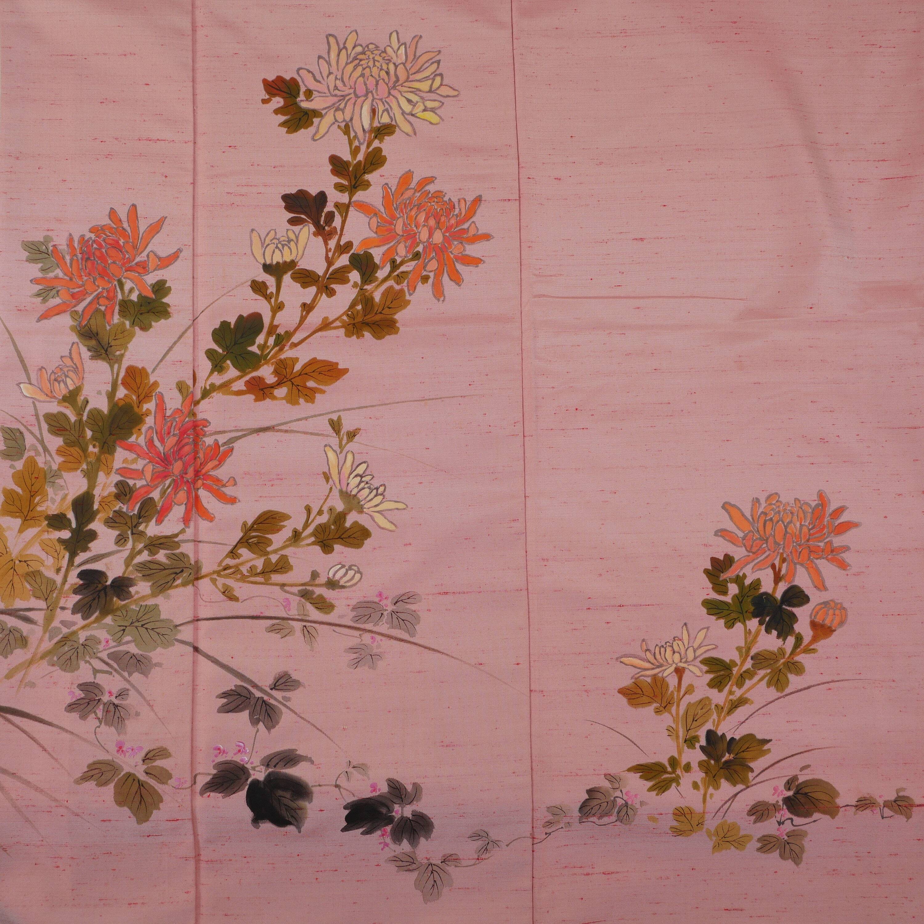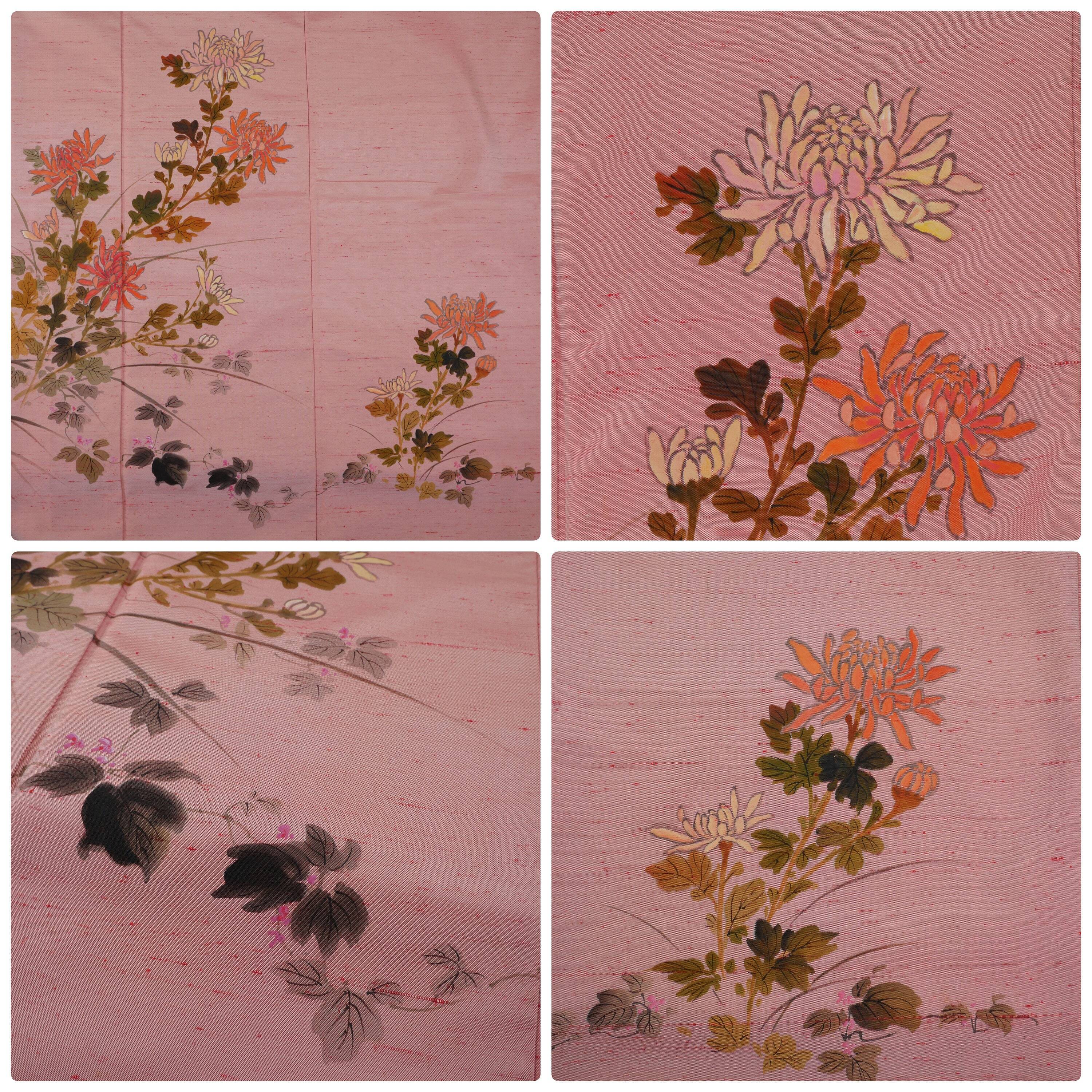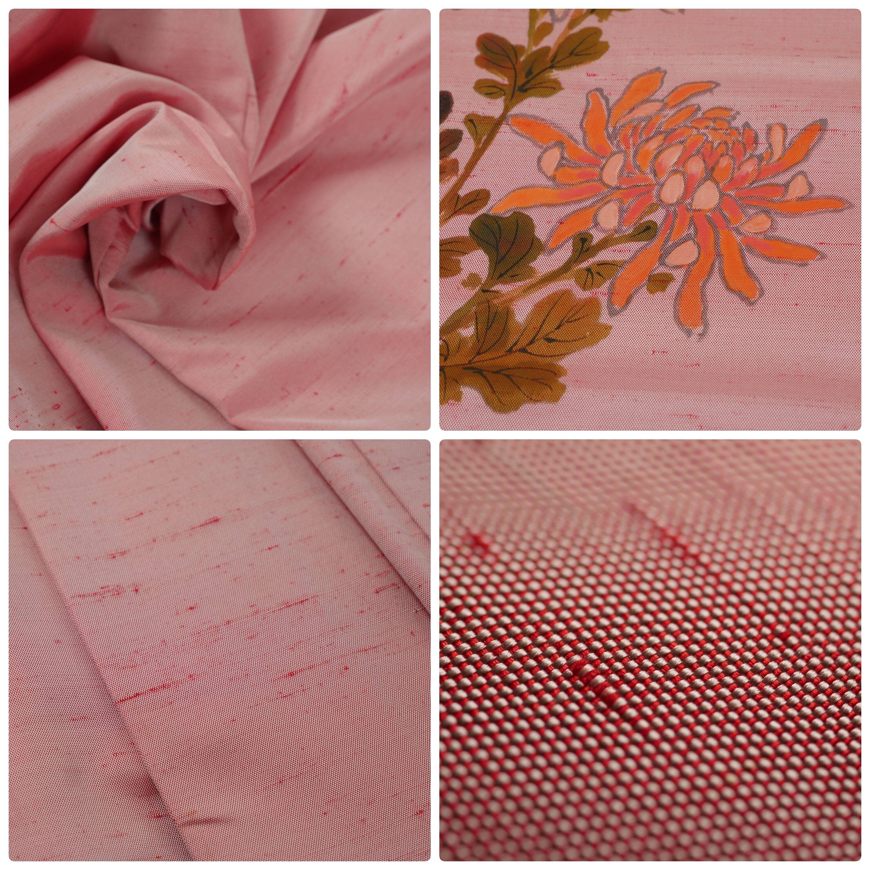 着物 袷 訪問着 桃色 正絹 紬 手描き友禅